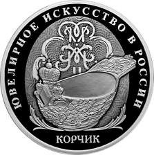 Таким предметом является серебряный корчик из собрания Гохрана России, в убранстве которого главная роль отведена государственной символике. Особенно выделяется чеканное изображение Святого Георгия Победоносца – герба Москвы, помещенное на груди орла.